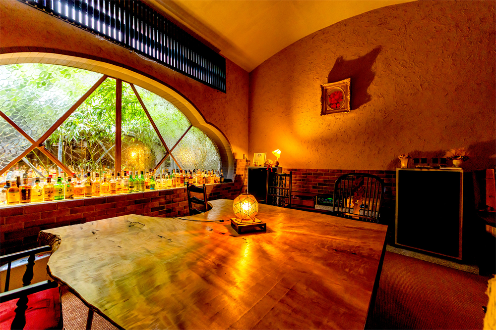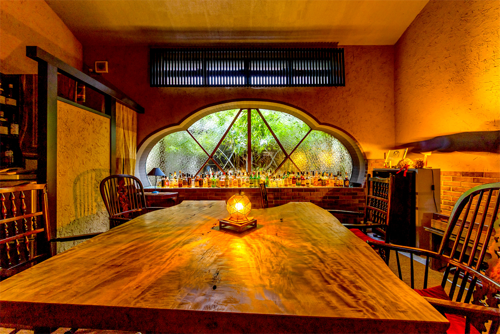 バーの中央には樹齢500年の栃の木のテーブル